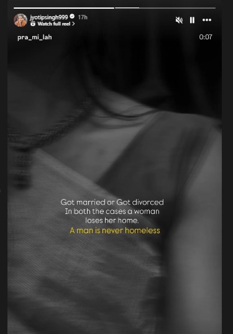 ज्योति की दूसरी स्टोरी और भी ज्यादा भावनात्मक थी। उन्होंने लिखा, “शादी करो या तलाक दो, दोनों ही हालात में औरत ही अपना घर खोती है। एक आदमी कभी बेघर नहीं होता।”* यह लाइन सोशल मीडिया पर तेजी से वायरल हो रही है और महिलाओं की स्थिति, सामाजिक सोच और रिश्तों में असमानता को लेकर नई बहस छेड़ चुकी है।