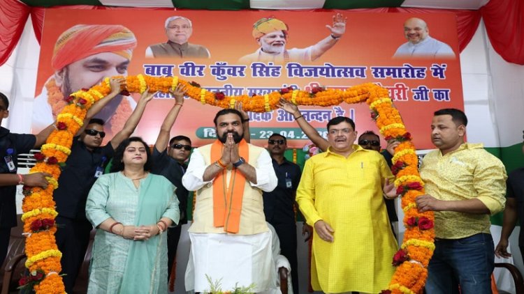 CM सम्राट चौधरी अमर स्वतंत्रता सेनानी वीर कुंवर सिंह की जयंती के अवसर पर उनकी प्रतिमा पर माल्यार्पण करते हुए